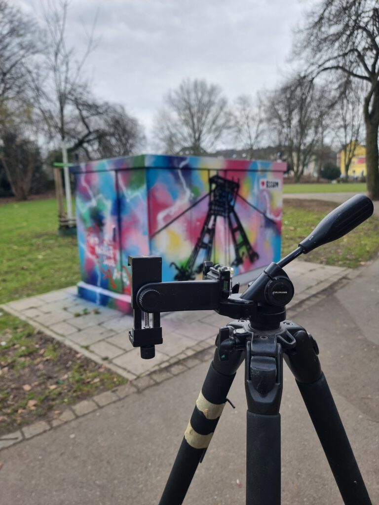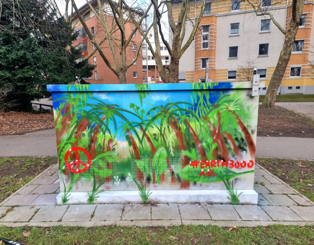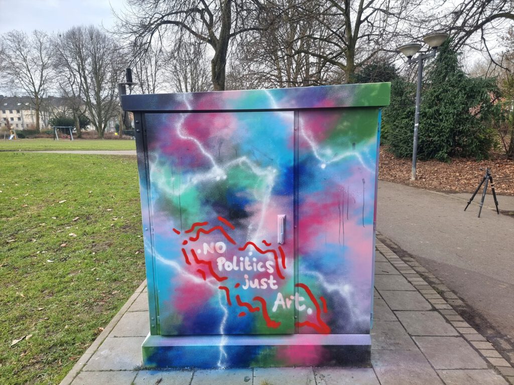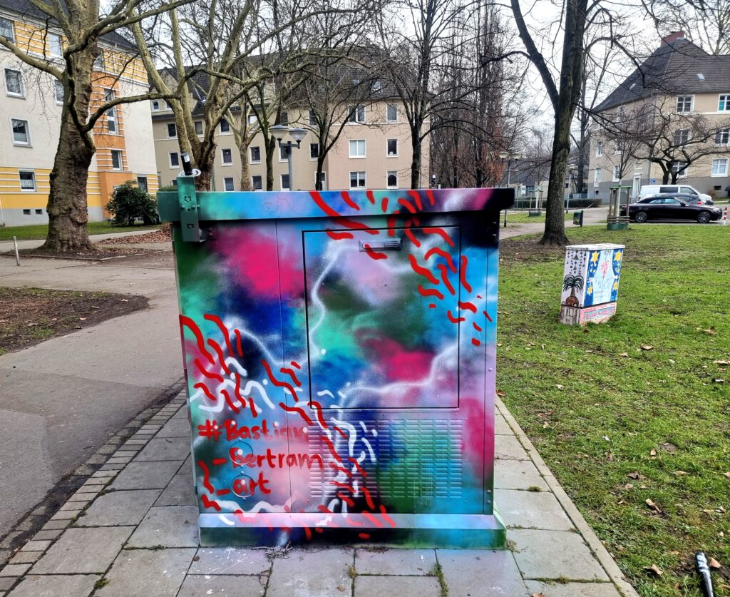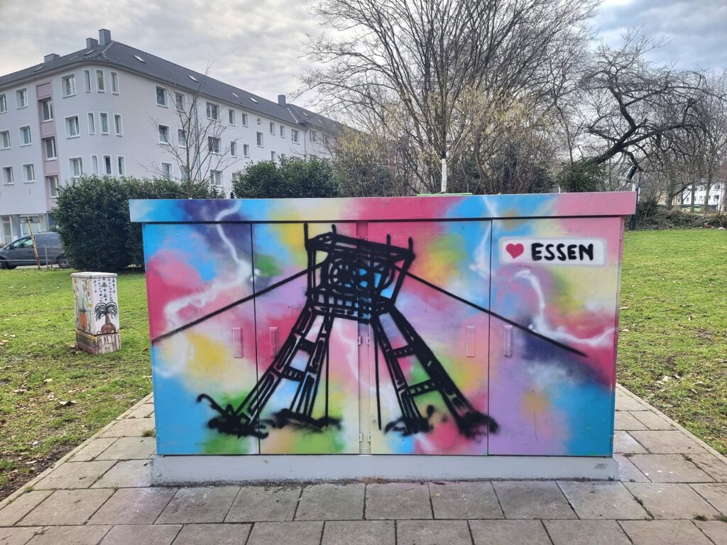 Transformer Stories – From Conflict to ColorOnce a neglected utility box, this transformer stood as a silent battleground—layered with tags, symbols, and messages from competing political and cultural voices. It reflected division, tension, and the constant struggle for visibility in public space.Today, through the artistic intervention of Bastian Bertram Art, the transformer has been reimagined. One side pays homage to the industrial heritage of Essen, capturing the iconic mining structure in bold, expressive lines against a vibrant, almost explosive color field. The other side envisions a possible future—lush, overgrown, and alive—where nature reclaims space and harmony replaces conflict.What was once an eyesore has become an eye-catcher: a transformation not only of surface, but of meaning. The artwork turns a site of confrontation into a place of reflection, inviting viewers to consider past, present, and future in one continuous visual dialogue.